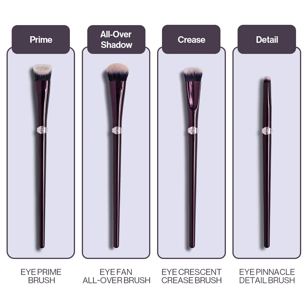 This set includes the Eye Primer Brush, Eye Crescent Crease Brush, Eye Fan All-Over Brush, and Eye Pinnacle Detail Brush.
